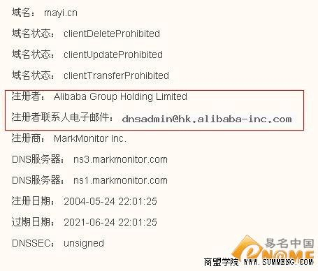 10月16日,阿里巴巴旗下的螞蟻金融服務(wù)集團宣告成立,業(yè)務(wù)囊括了包括支付寶、余額寶等在內(nèi)的多個知名品牌。當時,“螞蟻”域名mayi.cn 等還均未顯示在阿里名下,不過按照阿里重視品牌域名保護的傳統(tǒng),收購也是早晚的事?,F(xiàn)查詢易名whois 信息系統(tǒng),mayi.cn 和mayi.com.cn 的持有人信息均已變更為阿里巴巴。