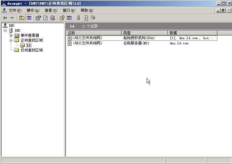 4. 完成“DNS 服務(wù)器的配置”后,在DNS 控制臺的正向查找區(qū)域可以看到下圖畫面