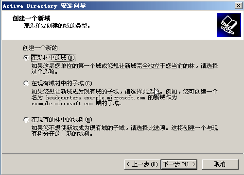 單擊【下一步】按鈕,出現(xiàn)一個“創(chuàng)建一個新域”對話框。選擇“在新林中的域”。