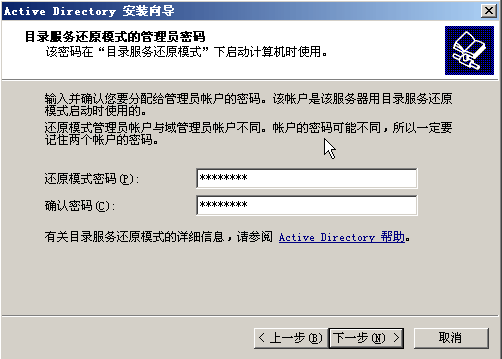 單擊【下一步】按鈕,出現(xiàn)“目錄服務(wù)還原模式的管理員密碼”對話框。設(shè)置密碼。