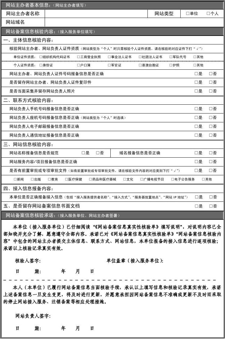 一、依據(jù)《工業(yè)和信息化部關(guān)于進(jìn)一步落實(shí)網(wǎng)站備案信息真實(shí)性核驗(yàn)工作方案(試行)》、《備案信息填報(bào)真實(shí)性和規(guī)范性的有關(guān)要求》,制定《網(wǎng)站備案信息真實(shí)性核驗(yàn)單》(以下簡(jiǎn)稱(chēng)“《核驗(yàn)單》”)。核驗(yàn)單一式兩份:一份接入服務(wù)單位留存,一份上報(bào)網(wǎng)站主體所在地通信管理局。