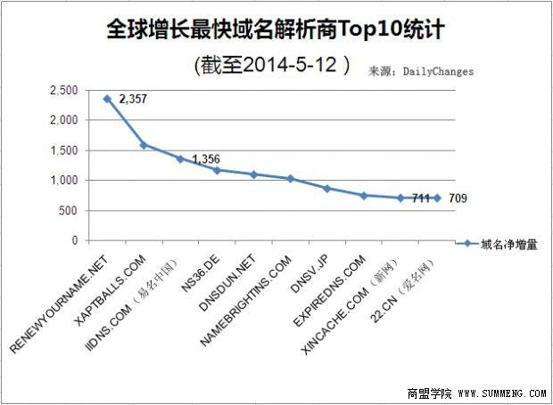 全球增長(zhǎng)最快域名解析商Top10:易名中國(guó)、新網(wǎng)和愛名網(wǎng)上榜 )05月13日?qǐng)?bào)道:據(jù)國(guó)外域名統(tǒng)計(jì)機(jī)構(gòu)DailyChanges 最新實(shí)時(shí)數(shù)據(jù)顯示,5月12日,在全球增長(zhǎng)最快的十家域名解析服務(wù)商榜單上,