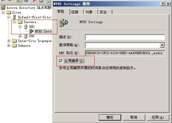 site->default-first-site-name->servers,你會看到兩臺域控制器都在下面。展開BDC ,右擊【NTDS Settings 】點【屬性】,勾上全局編錄前面的勾,點確定,如圖: