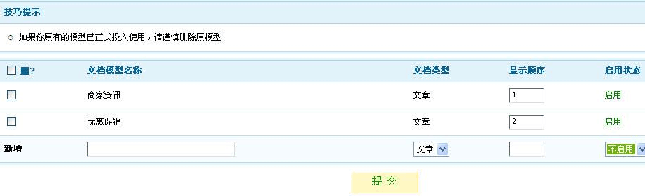 Mymps 內(nèi)置了兩種文檔模型,商家資訊和優(yōu)惠促銷,亦可新增文檔模型,如下圖