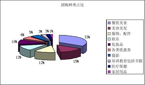 說明:目前各大團購網(wǎng)站的團購種類仍是集中在餐飲美食、美容美發(fā),分別占到團購種類的