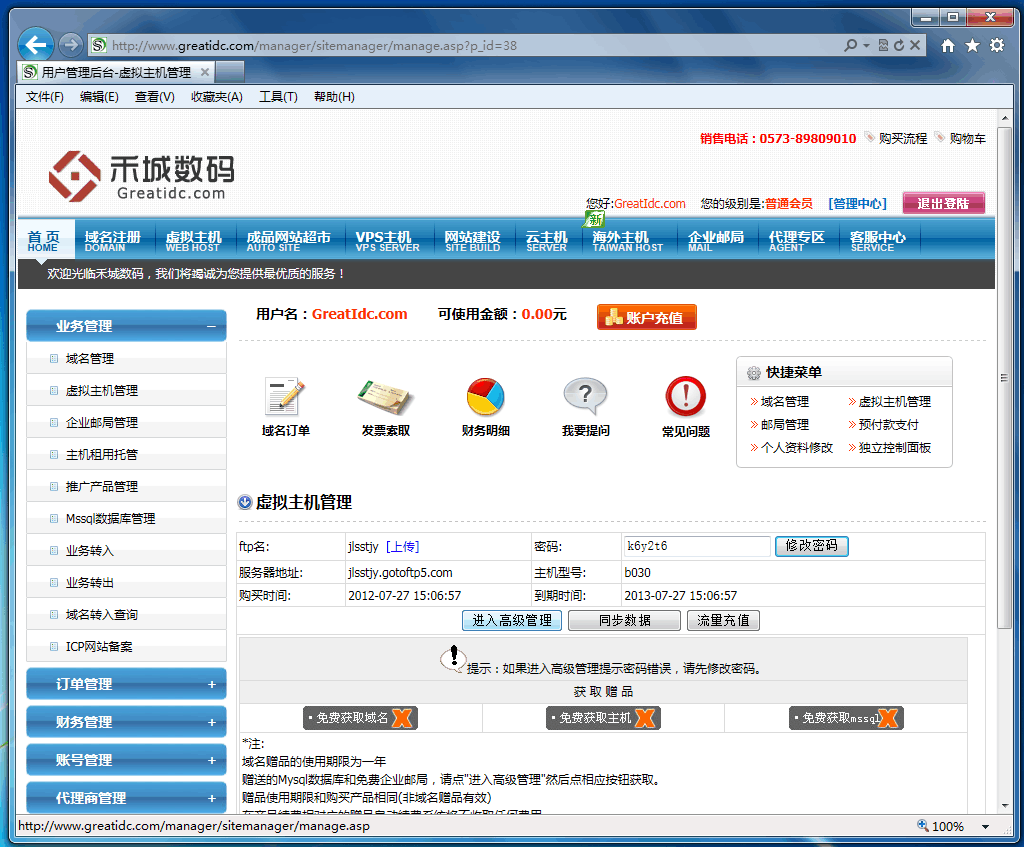 首先,打開(kāi)www.greatidc.com ,并且登錄成功如下圖所示。顯示登錄狀態(tài)。