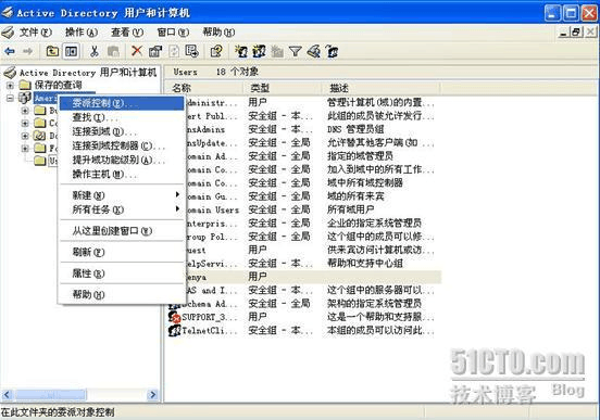 這樣點(diǎn)“下一步”,直到完成,就可以完成用戶的創(chuàng)建。然后在“American.com”上點(diǎn)擊右鍵,先擇“委派控制”: