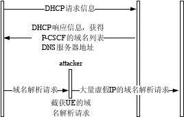 常見的DOS攻擊通常采用IP欺騙等方式向服務(wù)器發(fā)送大量的無用數(shù)據(jù)包。SA建立之后,IMS能夠杜絕IP地址欺騙。但是UE在發(fā)送(11)REGISTER消息之前,沒有對所傳送的消息進(jìn)行任何保護(hù)。所以在注冊流程的第一個往返過程中可能發(fā)生DOS攻擊。因為3GPP/3GPP2沒有對如何防止DOS對DNS的攻擊作相關(guān)定義,所以可以在P-CSCF發(fā)現(xiàn)流程中對DNS發(fā)起DOS攻擊。設(shè)計攻擊流程如圖3。