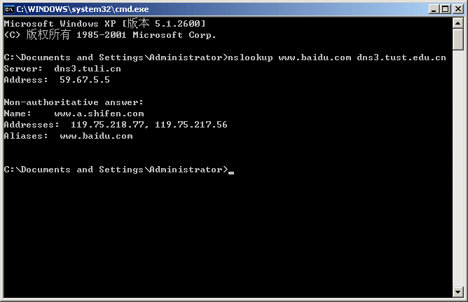 第三條命令:nslookup www.baidu.com dns2.edu.cn