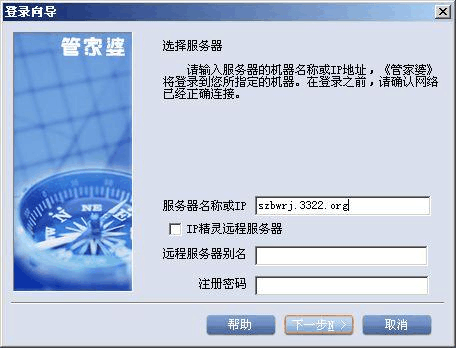 遠程的電腦正常安裝管家婆,注意, 無需安裝其他任何軟件,直接運行網(wǎng)絡版即可。 服務器名稱或IP 地址填寫申請的域名即可,如下圖。