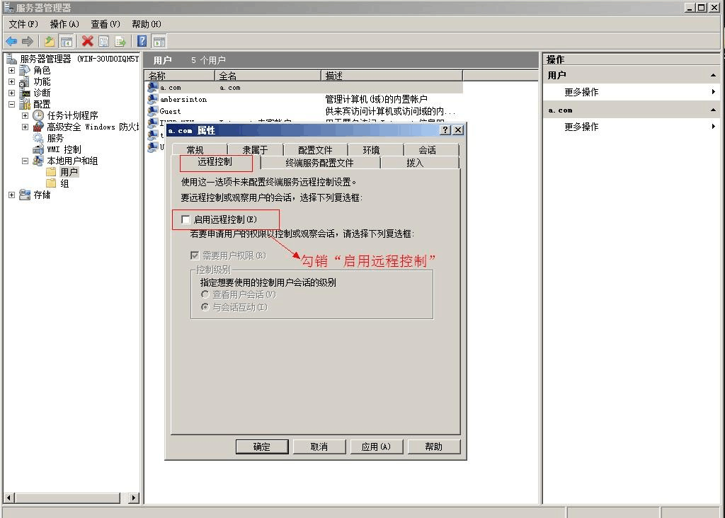 3.選擇剛創(chuàng)建的用戶,雙擊或者右擊打開“屬性”,分別設(shè)置“遠(yuǎn)程設(shè)置”和“隸屬于”