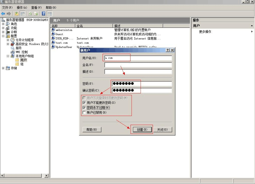 1.“計算機(jī)”-> 右鍵點擊 -> “管理” -> “配置” -> “本地用戶和組” -> “用戶” -> 右鍵點擊 -> “新用戶”;