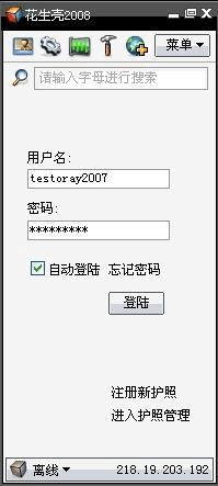 2. 運(yùn)行花生殼軟件,點(diǎn)擊“注冊(cè)新護(hù)照”,根據(jù)彈出注冊(cè)護(hù)照窗口提示進(jìn)行注冊(cè)。注冊(cè)新護(hù)照完成后,使用所注冊(cè)的護(hù)照名稱和密碼填入花生殼軟件中進(jìn)行登陸。