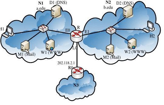 N2申請(qǐng)到b.edu 的域名,通過D2進(jìn)行管理并提供域名解析服務(wù);W2提供www.a.edu 站點(diǎn)的web 服務(wù);M2提供a.edu 域的郵件收發(fā)服務(wù)。