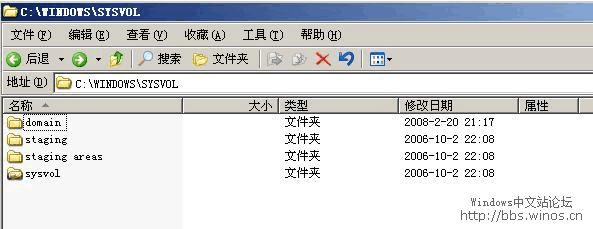 b. 在c:windowssysvol目錄下再新建一個文件夾:domain 、staging 、staging areas、sysvol c. 在C:WINDOWSSYSVOLdomain目錄下新建兩個文件夾:Policies 和Scripts