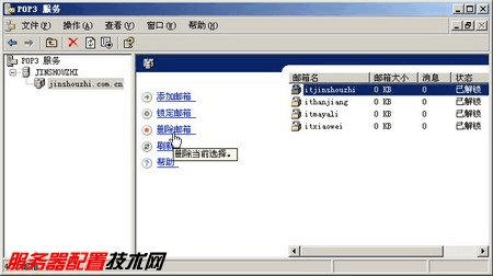 第4步,重復(fù)上述步驟繼續(xù)添加其他郵箱,在“POP3服務(wù)”窗口中選中郵件域名,會(huì)在右窗格中顯示出已經(jīng)添加的郵箱。選中指定的郵箱名,可以對(duì)其進(jìn)行鎖定和刪除等管理操作,如圖2008112130所示。