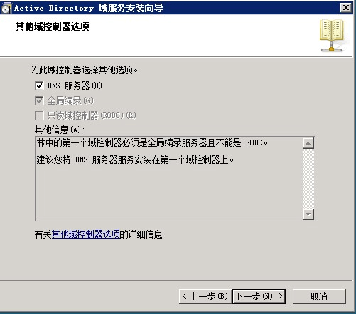 在彈出的窗口中,系統(tǒng)會(huì)自動(dòng)把DNS 勾選,因?yàn)槭怯蛑械牡谝慌_(tái)域控制器,所以默認(rèn)為全局錄服務(wù)器。單擊“下一步”