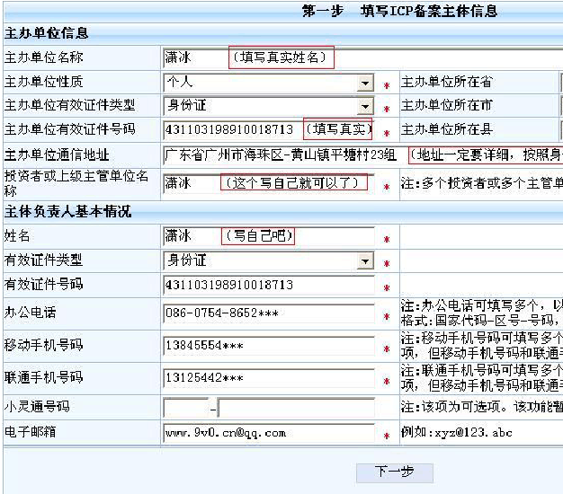 第五步:輸入你要備案網(wǎng)站的注冊資料比如我的www.yunhai78.com ,這點很簡單,相信大家都會,如圖: