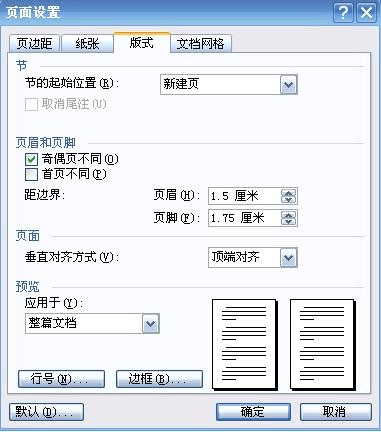 (4)(5)第一步:首先打開“文件”中的“頁面設置”,按“頁面設置”中的“版式”:在“頁眉和頁腳”那一項點擊“奇偶頁不同”。 再按“確定”鍵。如下圖: