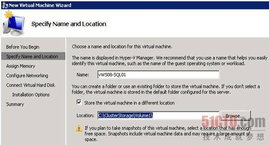 我這里將虛擬機(jī)名字命名為vWS08-SQL01,VM 存放位置選擇了C:ClusterStorageVolume1,VM 配置文件也創(chuàng)建在共享存儲(chǔ)上。