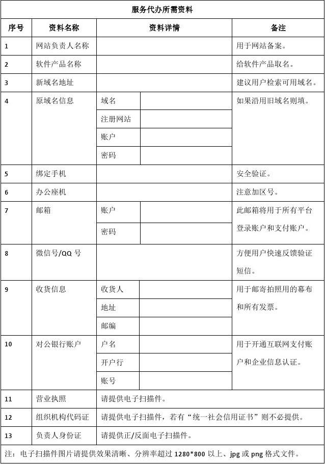 辦理過程中服務(wù)代辦人員請(qǐng)需按下面模板記錄好各平臺(tái)賬戶和其他重要信息,各平臺(tái)具體操作方式詳見各平臺(tái)幫助中心或咨詢客服: