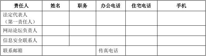 九、本單位建立信息安全責(zé)任制度,法定代表人為本單位網(wǎng)站信息安全第一責(zé)任人,網(wǎng)站論壇負(fù)責(zé)人及相關(guān)人員依法承擔(dān)直接責(zé)任或其他相應(yīng)責(zé)任。在通信管理部門通知刪除違法和有害信息、責(zé)令暫時關(guān)閉網(wǎng)站或有關(guān)欄目時,立即執(zhí)行。網(wǎng)站責(zé)任人和聯(lián)系人發(fā)生變動時,保證在5個工作日內(nèi)書面報告省通信管理局。