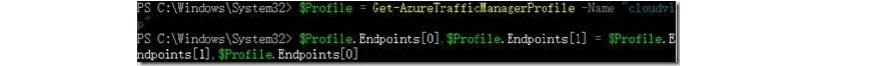 第一個(gè)命令是使用Get-AzureTrafficManagerProfile 得到cloudvip 的參數(shù)然后存放在TrafficManagerProfile 變量中。