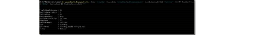 New-AzureTrafficManagerProfile -Name "cloudvip" -DomainName "clou dvip.trafficmanager.net" -LoadBalancingMethod "Failover" -Ttl 30 -MonitorProtocol "Http" -MonitorPort 80 -MonitorRelativePath "/" 表示我要?jiǎng)?chuàng)建一個(gè)cloudvip 的Profile ,域名為cloudvip.trafficmanager.net ,負(fù)載平衡方法是故障轉(zhuǎn)移,監(jiān)視內(nèi)容:協(xié)議http 端口 80 默認(rèn)路徑。