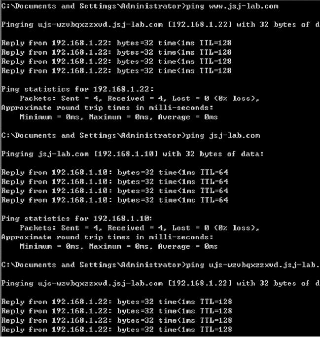 5)在本地機(jī)器和虛擬機(jī)上ping www.jsj-lab.com/ping jsj-lb.com/ping ujs1.jsj-lab.com,記錄結(jié)果