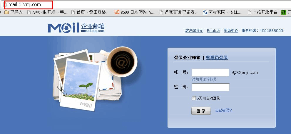,有提示(每個郵箱賬戶都要手動設(shè)置綁定QQ 號才可以聯(lián)通QQ 郵箱)?,F(xiàn)在還有個問題就是,每次登錄企業(yè)郵箱的時候都是要輸入網(wǎng)址 https://exmail.qq.com/login 很麻煩,現(xiàn)在我們要做一個類似于http://mail.52erji.com 這樣的域名解析操作,一會我們只需要輸入 mail. 域名.com 或者 mail. 域名.net 或者其他域名后綴 就可以打開企業(yè)郵箱登錄地址了。