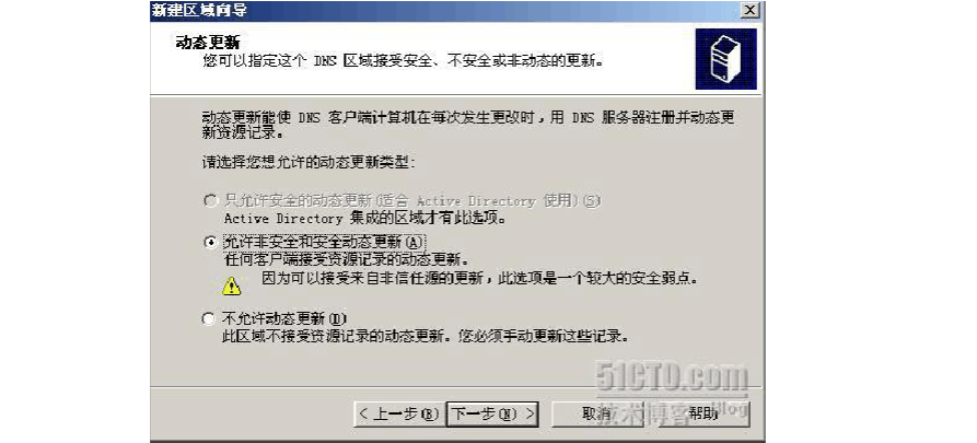 注意,區(qū)域必須允許動(dòng)態(tài)更新,因?yàn)樵趧?chuàng)建AD 的過程中需要向這個(gè)區(qū)域?qū)懭階 ,Cname 和SRV 記錄。