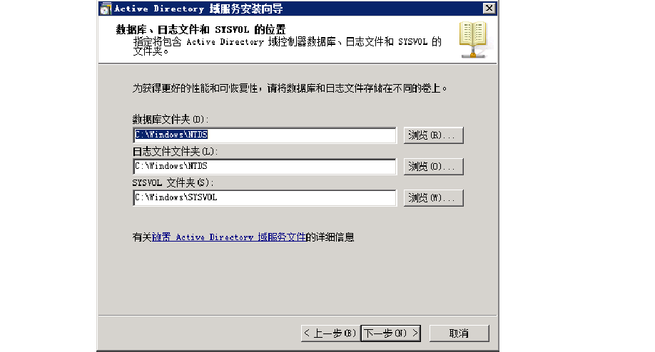 在“數(shù)據(jù)庫(kù)、日志文件和SYSVOL 的位置”頁(yè)面,點(diǎn)“下一步”。