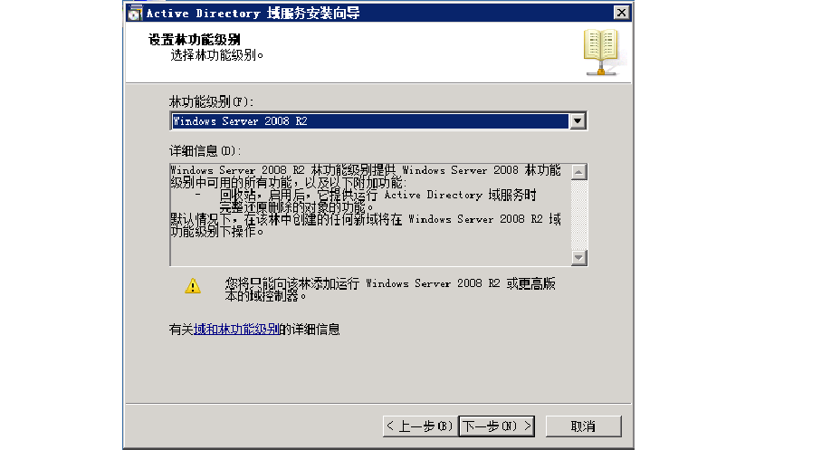 在“設(shè)置林功能級(jí)別”頁(yè)面,選擇林功能級(jí)別為“Windows Server 2008 R2”,然后點(diǎn)“下一步”。