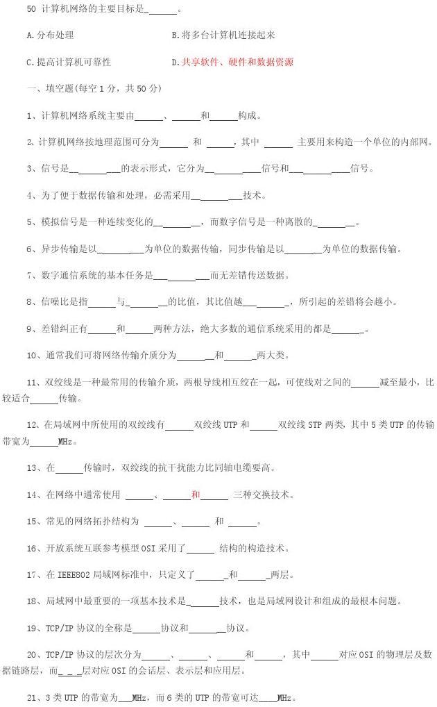 計算機網(wǎng)絡(luò)基礎(chǔ)試題 一、單項選擇題。(共50小題;每小題2分,共100分)01 "1965年科學(xué)家提出“超文本”概念,其“超文本”的核心是______。A. 鏈接 B.網(wǎng)絡(luò)