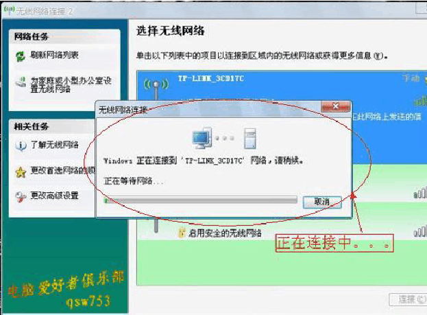 6. 再在彈出的無(wú)線連接表中,找到自己的無(wú)線路由器,點(diǎn)擊,并選擇“連接”。 注意:一般信號(hào)最強(qiáng)的且沒(méi)有加密的(沒(méi)有小鎖的標(biāo)記)就是自己的。 如圖: