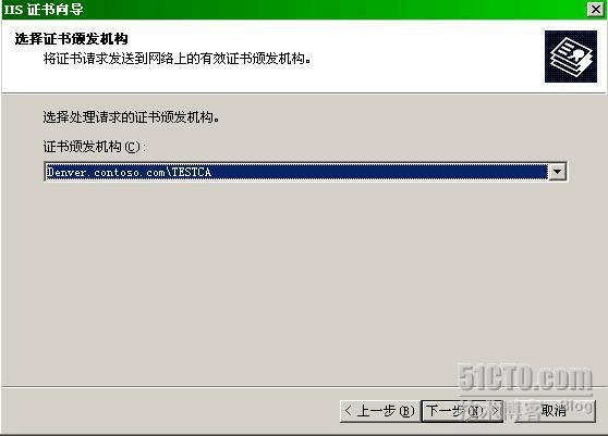 由于Denver 上的證書服務(wù)器是企業(yè)根,支持在線頒發(fā)證書,因此我們選擇“立即把證書請求發(fā)送到聯(lián)機證書頒發(fā)機構(gòu)”。