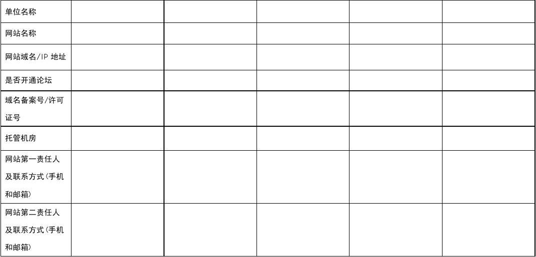 注:若有多個(gè)網(wǎng)站,則分列填寫(xiě),有幾個(gè)填幾列,如本表列數(shù)不夠可自行增加列。各列中網(wǎng)站名稱、域名/IP地址、域名備案號(hào)/許可證號(hào)、網(wǎng)站第一、二責(zé)任人按實(shí)際填寫(xiě)。