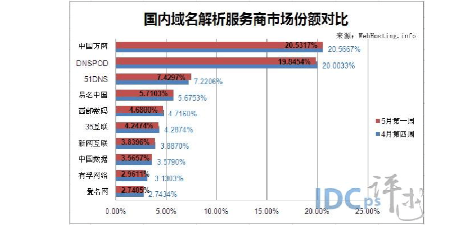 5月第一周國(guó)內(nèi)域名解析商Top10:萬(wàn)網(wǎng)、DNSPod 份額下滑IDC評(píng)述網(wǎng)(idcps.com )05月12日?qǐng)?bào)道:根據(jù)WebHosting.info 最新數(shù)據(jù)顯示,5月第一周(4月29日-5月5日