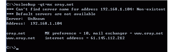 nslookup 命令會采用先反向解釋獲得使用的 DNS 服務(wù)器的名稱,由于我這里使用的是一個內(nèi)部的 DNS 服務(wù)器所以沒有正確的反向記錄,導(dǎo)致結(jié)果的前面幾行出錯。大家可以不必理會。重點(diǎn)看的是最后的兩行這里看到的是 www.oray.net 的 IP 地址是 61.145.112.212 。注意即使 www.oray.net 的主機(jī)沒有在線同樣能夠返回結(jié)果。