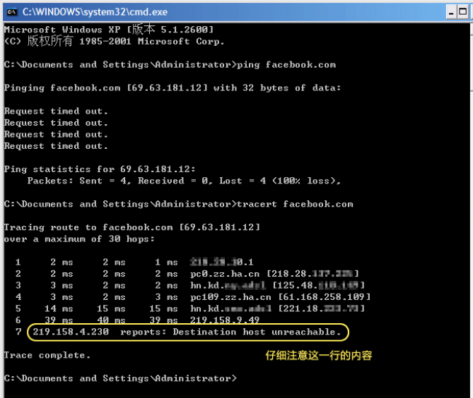仔細(xì)注意 tracert 的結(jié)果,有興趣的朋友可以查查被截?cái)嗟腎P 是哪里的,這樣那個(gè)崗哨的位置我想大家就明白在哪里了吧~另外,我現(xiàn)在在鄭州出差,所以,tracert 的結(jié)果前半段顯示的是河南,您自己 tracert 前半段就是自己的省市級(jí)節(jié)點(diǎn)??吹窖舆t忽然升高的地方,除了那個(gè)崗哨,就說(shuō)明“出國(guó)”了~