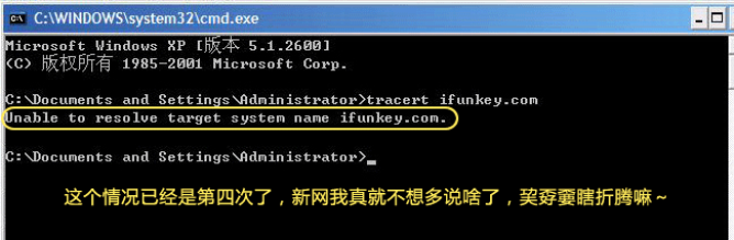 上圖是在昨天新網(wǎng)DNS 故障時(shí) tracert ifunkey.com的結(jié)果。Unable to resolve target system name ifunkey.com. 無(wú)法解析 ifunkey.com 這個(gè)域名,也就不知道去露西的家該怎么走,網(wǎng)站自然就無(wú)法打開(kāi)咯~