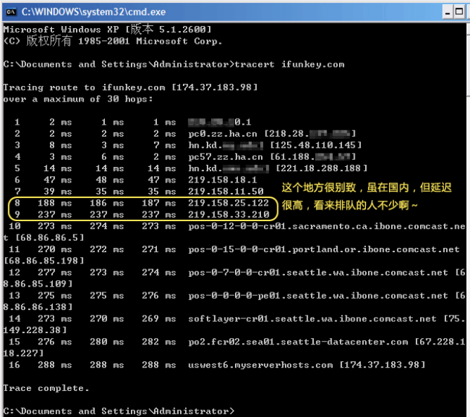 解析正確的情況下 tracert ifunkey.com 的結(jié)果。恩,路上有點(diǎn)堵車(chē),延遲有點(diǎn)高?。ㄒ?yàn)槲疫@里在下片片^^),而且當(dāng)我走到第8和第9條街的時(shí)候,IP 顯示雖在國(guó)內(nèi),但還是耽擱了不少時(shí)間,為什么呢,因?yàn)槟抢镉袓徤?,要檢查!但最終還是走到了露西的家~敲開(kāi)了門(mén)~叉叉叉~