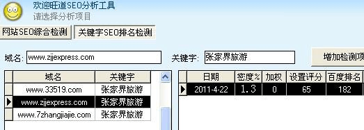 這三個網(wǎng)站都是旅游,關(guān)鍵字是:張家界旅游,我們先用旺道檢測工具查看網(wǎng)站的排名情況,因為關(guān)鍵詞有地域限制,地區(qū)是張家界,國內(nèi)一般用的是百度。