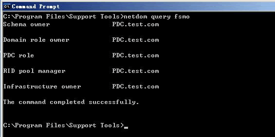 二、在上面的操作中我們已經(jīng)安裝了windows 2003 的support tools 了,所以我現(xiàn)在在找開support tools,在命令提示符下輸入netdom query fsmo查看一下當(dāng)前的五個(gè)前色的owner 是誰,如圖: