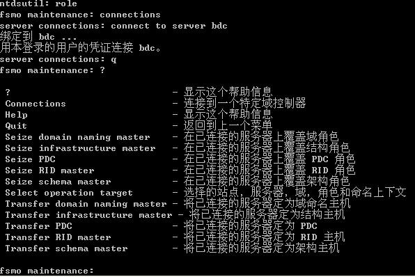 三、再次打開 support tools 在命令提示符下輸入ntdsutil 回車,再輸入:roles 回車,再輸入connections 回車,再輸入connect to server test.com(其實(shí)上面這里我寫的是BDC 的計(jì)算機(jī)名,