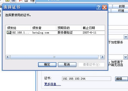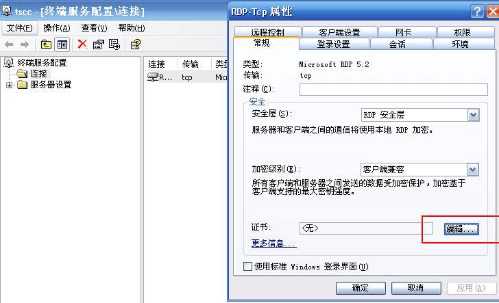 在管理工具中,打開終端服務(wù)配置,在左邊的窗格中單擊連接,然后在右邊雙擊連接,在彈出的對話框的常規(guī)選項卡中,首先單擊證書旁邊的編輯