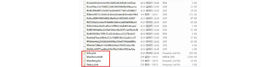 如圖3所示,打開備份目錄可以看到一大堆40位16進(jìn)制數(shù)組成文件名的文件,這些文件就是APP 的數(shù)據(jù)文件。面對這些符號復(fù)雜的文件,怎么才能知道這些文件是哪個APP 產(chǎn)生的數(shù)據(jù)呢?不急,圖片下面有幾個明文的文件,我們可以在這幾個文件中找到想要的一些信息。